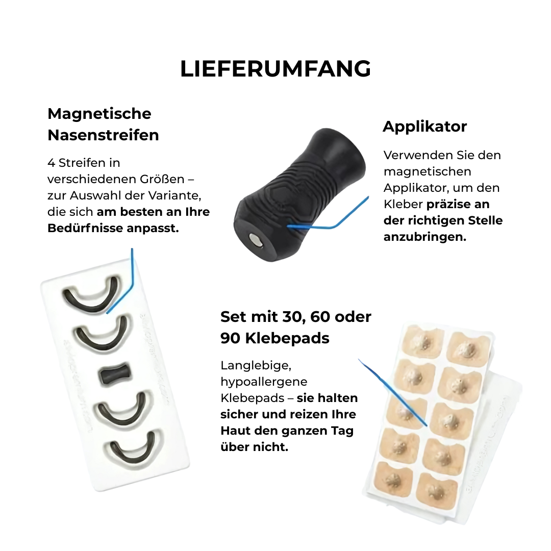 Integrierte Magnete stimulieren gezielt die Nasenpunkte und fördern die Atmung auf natürliche Weise.