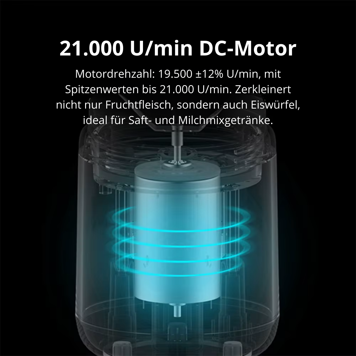 Hochgeschwindigkeits-DC-Motor (19.500–21.000 U/min) zerkleinert mühelos Obst, Eiswürfel und cremige Mischungen.